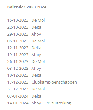 Noot; in verband met het opgebouwde bestand in het startprogramma graag ook bij de wedstrijden in het nieuwe kalender jaar ook je licentie van het oude jaar meenemen. Dit om vlotte inschrijving door inscannen mogelijk te maken.